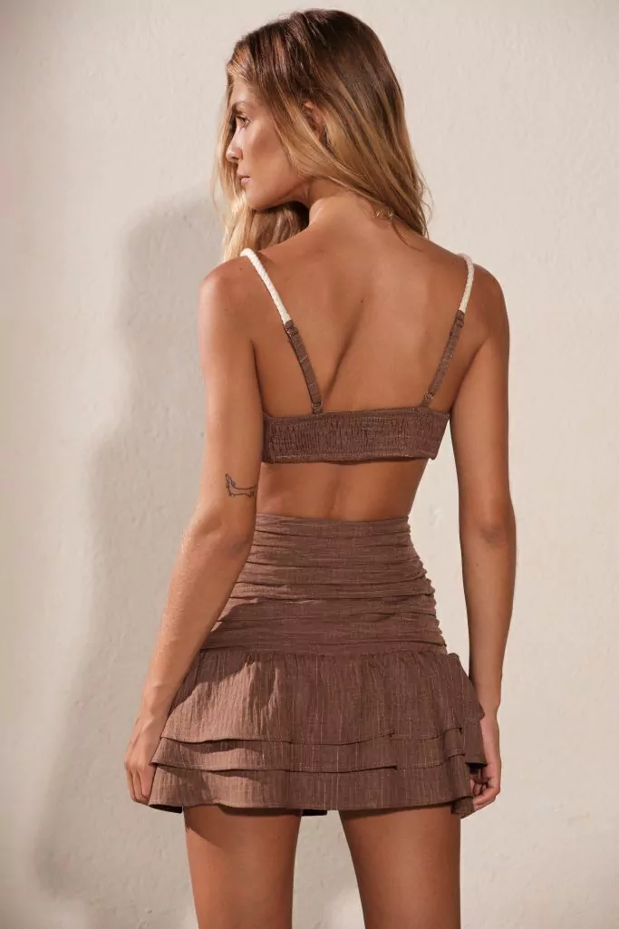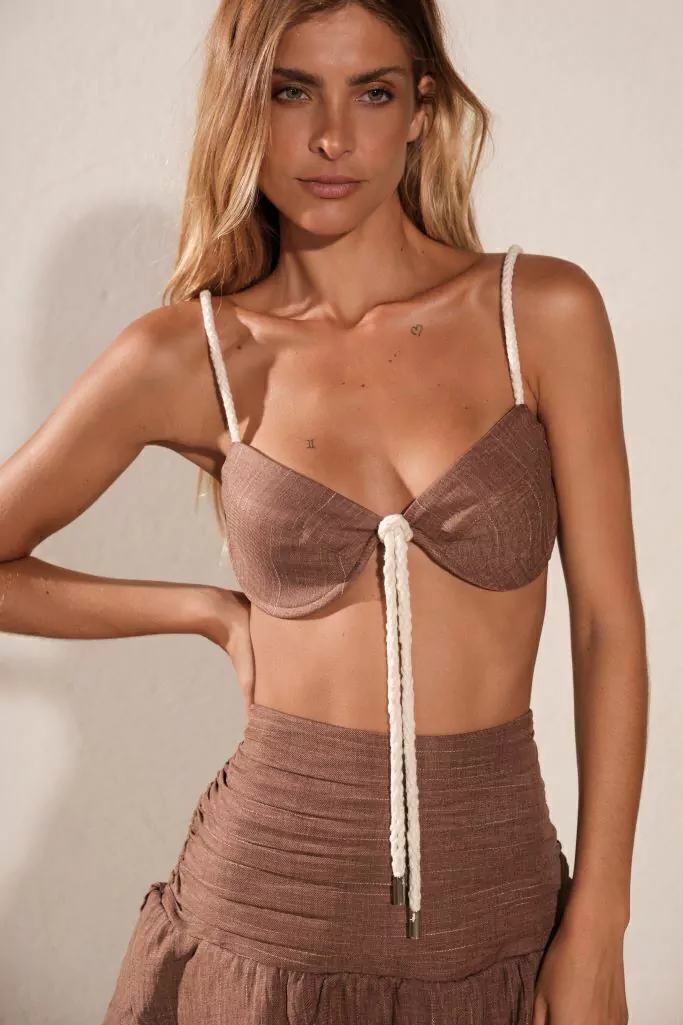 Blusa Cropped Mira confeccionada em alfaiataria, traz sofisticação com alças finas em cordão ajustáveis e elegante detalhe de amarração com ponteiras metálicas. Possui aro de sustentação para o busto, valorizando o decote, e costas em lastex para ajuste perfeito ao corpo. Ideal para compor looks modernos e refinados, proporcionando conforto e estilo em qualquer ocasião.